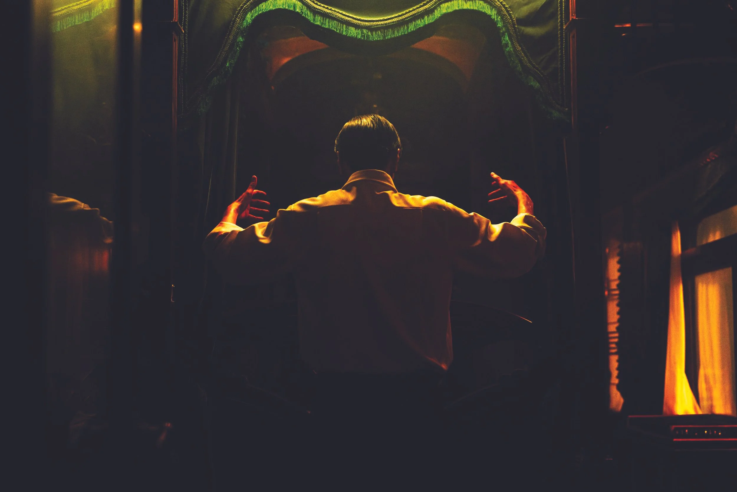 A more effective fiery moment captures Bi Gan’s sensitivity to visually and kinetically associated details: a dissolve carries a flaming bush by a lake into an interior shot of a spinning vinyl disc, whose shimmering surface under candlelight not only smoothes the transition, but also creates the illusion of efflorescence. In the dissolve, the wild flame by the lake transforms into a miniature firework blooming from beneath the stylus as it grazes the turntable’s groove. No less strikingly, an apparently unmotivated railway shot in the sequence awakens the viewer’s memory of those scintillating sparks that previously fly from train wheels screeching to a halt—all just before the mad Composer attempts to kill himself and Deliriant.